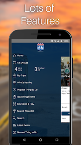 Appen innehåller detaljerade beskrivningar, kartor, artiklar, tips och saker att göra. Användare kan också skapa och spåra en personlig "att göra"-lista, se vad som finns i närheten och ta del av hundratals bilder som visar olika platser. Dessutom erbjuder appen aktuella väderförhållanden, en katalog över kommande evenemang och festivaler samt möjligheten att dela personliga tips och foton via sociala medier. Route 66 Travel Guide är idealisk för alla som vill upptäcka de unika upplevelserna längs denna historiska väg.